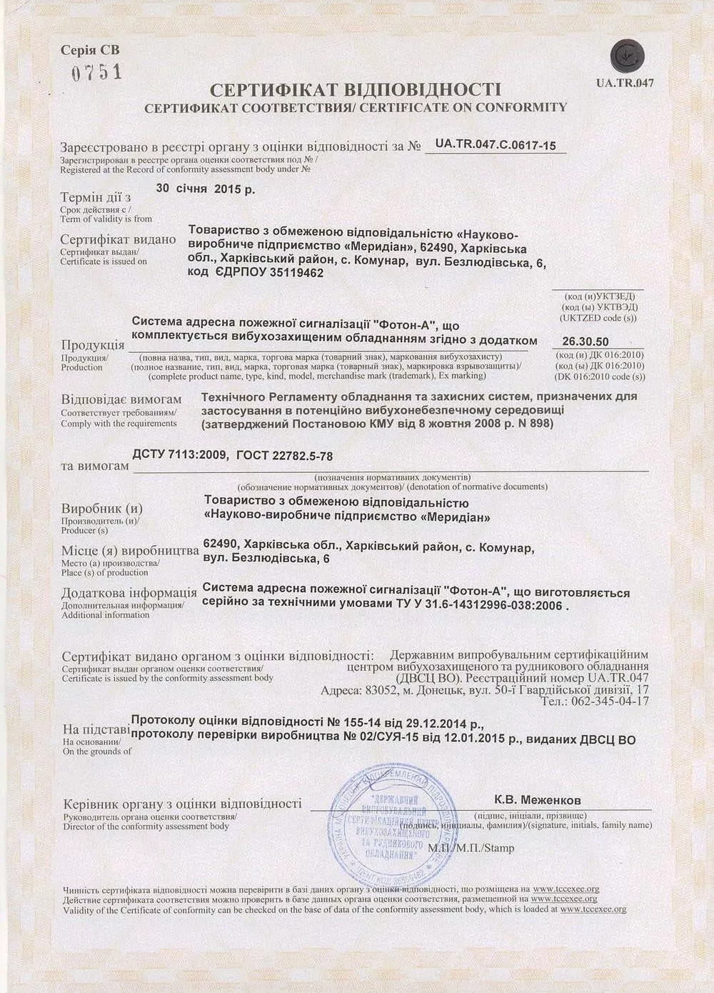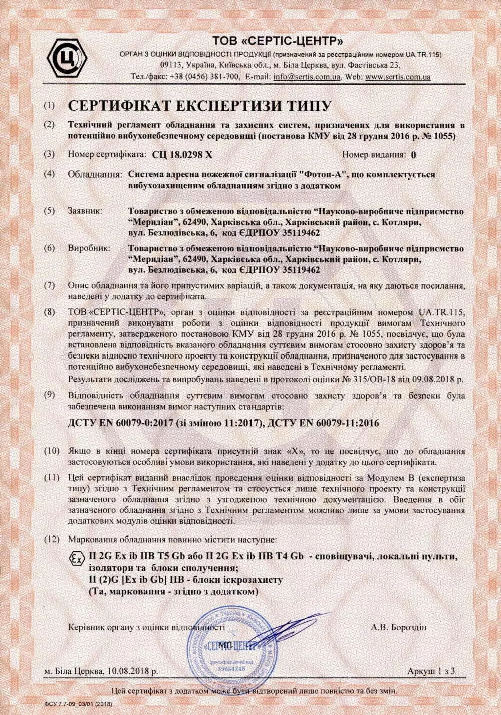 Сертифікат відповідності до "Фотон-А" з вибухозахищенним обладнанням