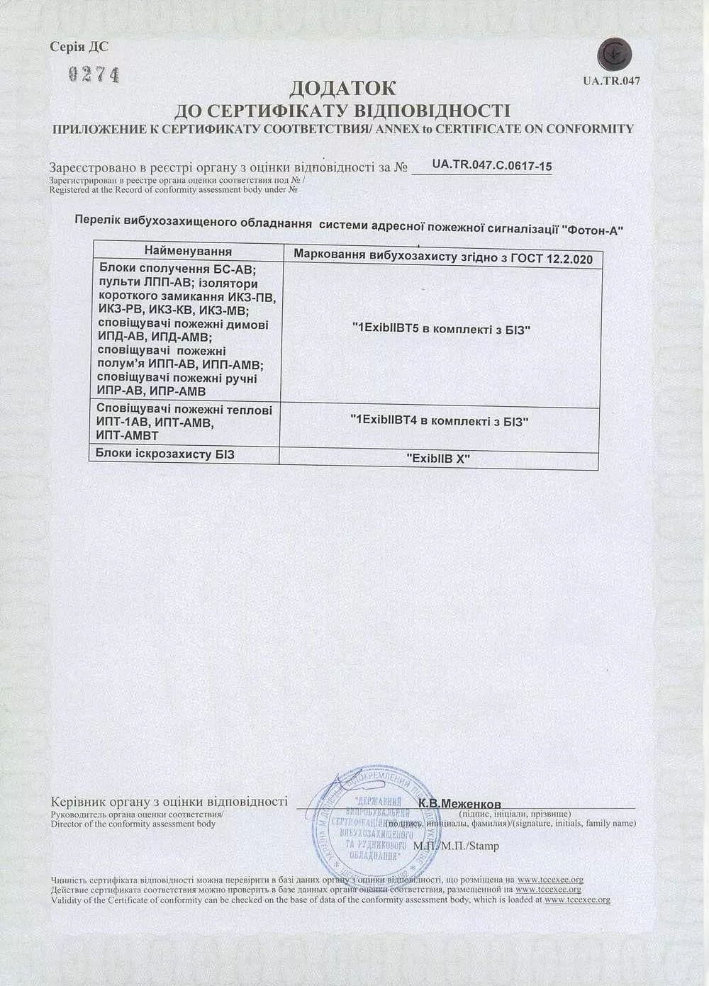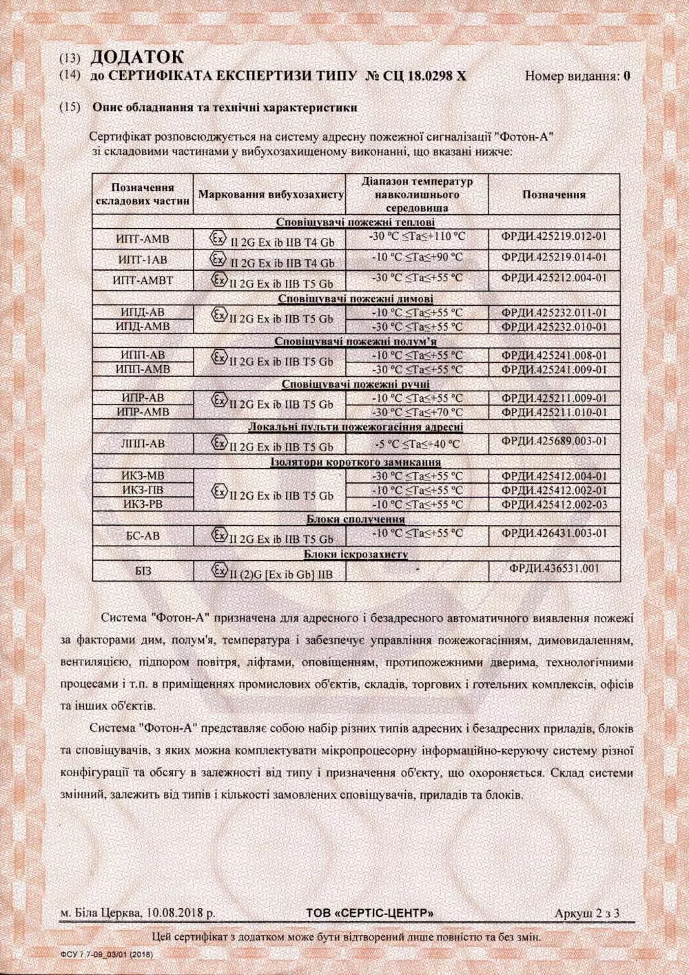 Додаток до сертифікату відповідності на "Фотон-А" з вибухобезпечним обладнанням