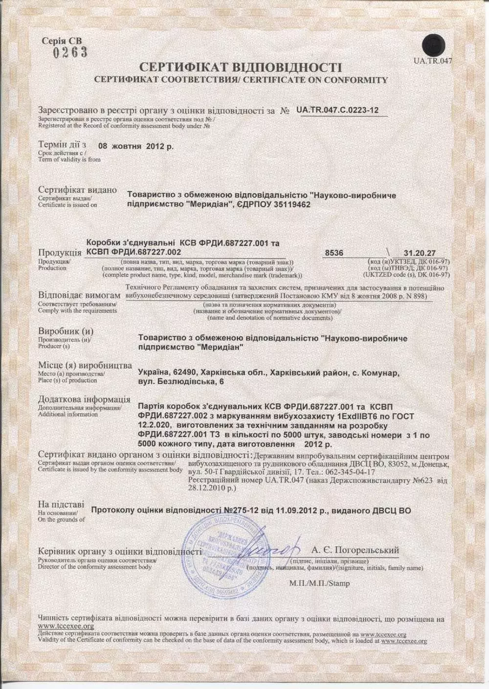 Сертифікат відповідності на коробки з'єднувальні КСВ та КСВП