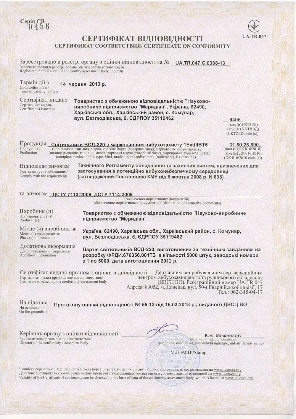 Сертифікат відповідності на світильник ВСД-220