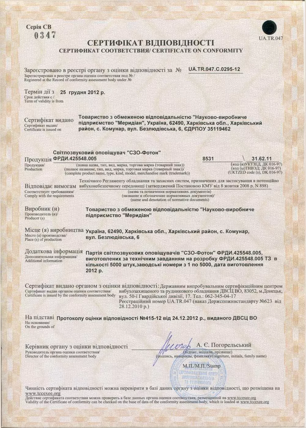 Сертифікат відповідності на Світло-звуковий оповіщувач "СЗО-Фотон"